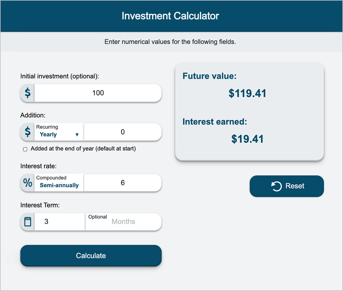 - An investment that applies compound interest at a rate of 6% per year, compounded semi-annually, and with the option to set up a recurring payment. This means that Ravi can add more money to the principal amount every year. He chooses to add $100/year.